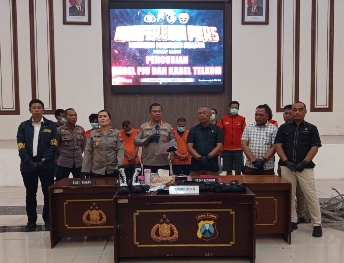 -Satreskrim Polrestabes Surabaya berhasil Membekuk 2 kasus pencurian kabel tembaga Telkom dan Penerangan Jalan Umum (PJU) di wilayah Kota Surabaya. Pengungkapan tersebut disampaikan dalam konferensi pers di Gedung Bhara Daksa, Rabu (03/12/2025) sore, Dipimpin Kapolrestabes Surabaya, Kombes Pol Luthfie Sulistiawan, didampingi Kasatreskrim AKBP Dr. Edy Herwiyanto, Kanit Resmob Iptu Raditya Herlambang dan Kasihumas AKP Rina.