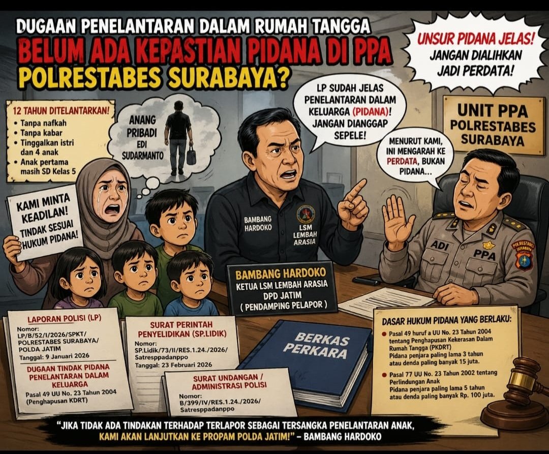 Surabaya, CyberNusantaraNews –Penanganan kasus dugaan penelantaran dalam rumah tangga di Unit Perlindungan Perempuan dan Anak (PPA) Polrestabes Surabaya menuai kritik tajam. Pelapor bersama pendamping dari LSM Lembah Arasia menyatakan ketidakpuasan atas belum adanya kepastian hukum pidana, meski laporan resmi kepolisian telah diterbitkan dan proses penyelidikan berjalan.