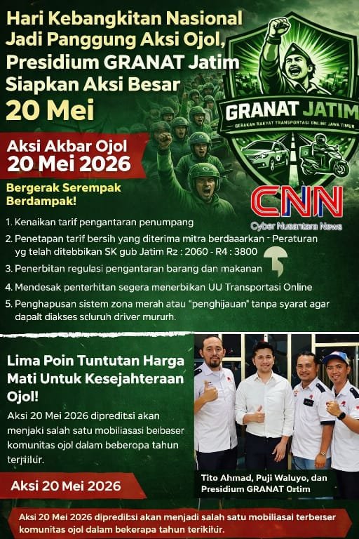 SURABAYA,– CyberNusantarNews Gerakan Rakyat Transportasi Online (GRANAT) Jawa Timur memastikan akan menggelar aksi besar-besaran pada Hari Kebangkitan Nasional, 20 Mei 2026. Aksi ini merupakan lanjutan dari gerakan serempak yang sebelumnya telah dideklarasikan di berbagai daerah pada tahun lalu (16/4).