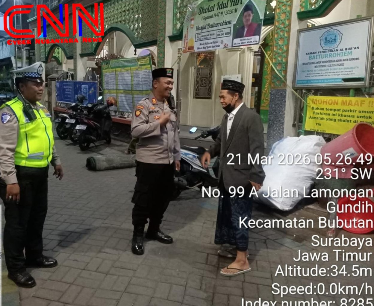 –Komitmen menjaga keamanan dan ketertiban masyarakat kembali ditunjukkan jajaran Polsek Bubutan Polrwstabes Surabaya, saat mengawal pelaksanaan Sholat Idul Fitri 1447 Hijriah/2026 Masehi di Masjid Baiturrahim, Jalan Lamongan, Kecamatan Bubutan, Sabtu (21/3/26).