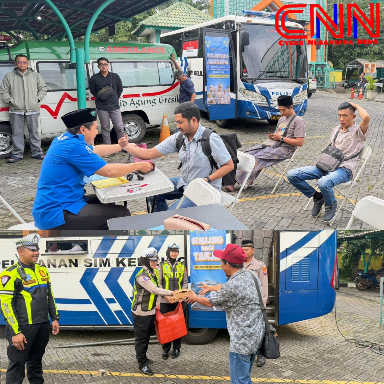 Tak hanya menghadirkan layanan administrasi, personel Satlantas Polres Gresik juga membagikan paket takjil gratis kepada para pemohon SIM serta pengendara yang melintas di sekitar area masjid.