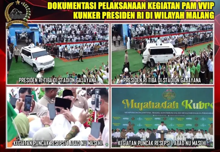 Kunjungan kerja Presiden RI dilaksanakan pada Minggu, 8 Februari 2026, dalam rangka menghadiri rangkaian puncak Resepsi 1 Abad Nahdlatul Ulama Masehi yang dipusatkan di Stadion Gajayana Kota Malang dengan melibatkan puluhan ribu peserta.