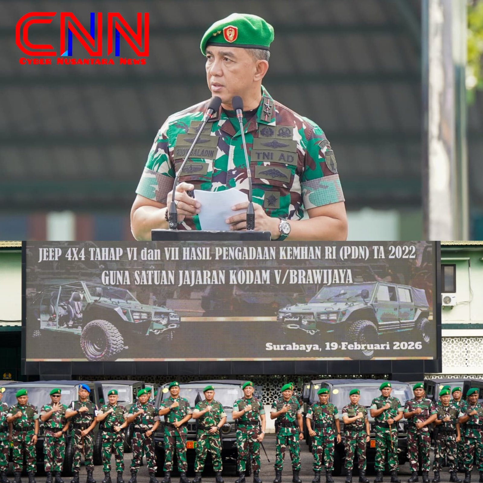 — Pangdam V/Brawijaya, Mayjen TNI Rudy Saladin M.A. memimpin acara penyerahan kendaraan dinas hasil pengadaan Kementerian Pertahanan RI Tahun Anggaran 2022 di Lapangan Ahmad Yani Makodam V/Brawijaya, Kamis (19/02/2026).