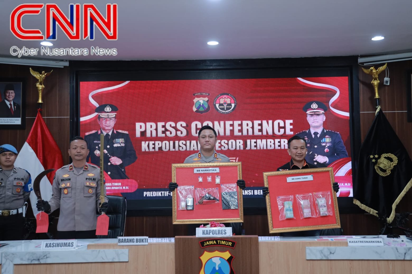 Kapolres Jember juga menyoroti sejumlah kasus menonjol yang berhasil diungkap, salah satunya penggerebekan pada 27 Maret 2026 oleh tim Satres Narkoba yang dibackup tim Alap-Alap dan Samapta.