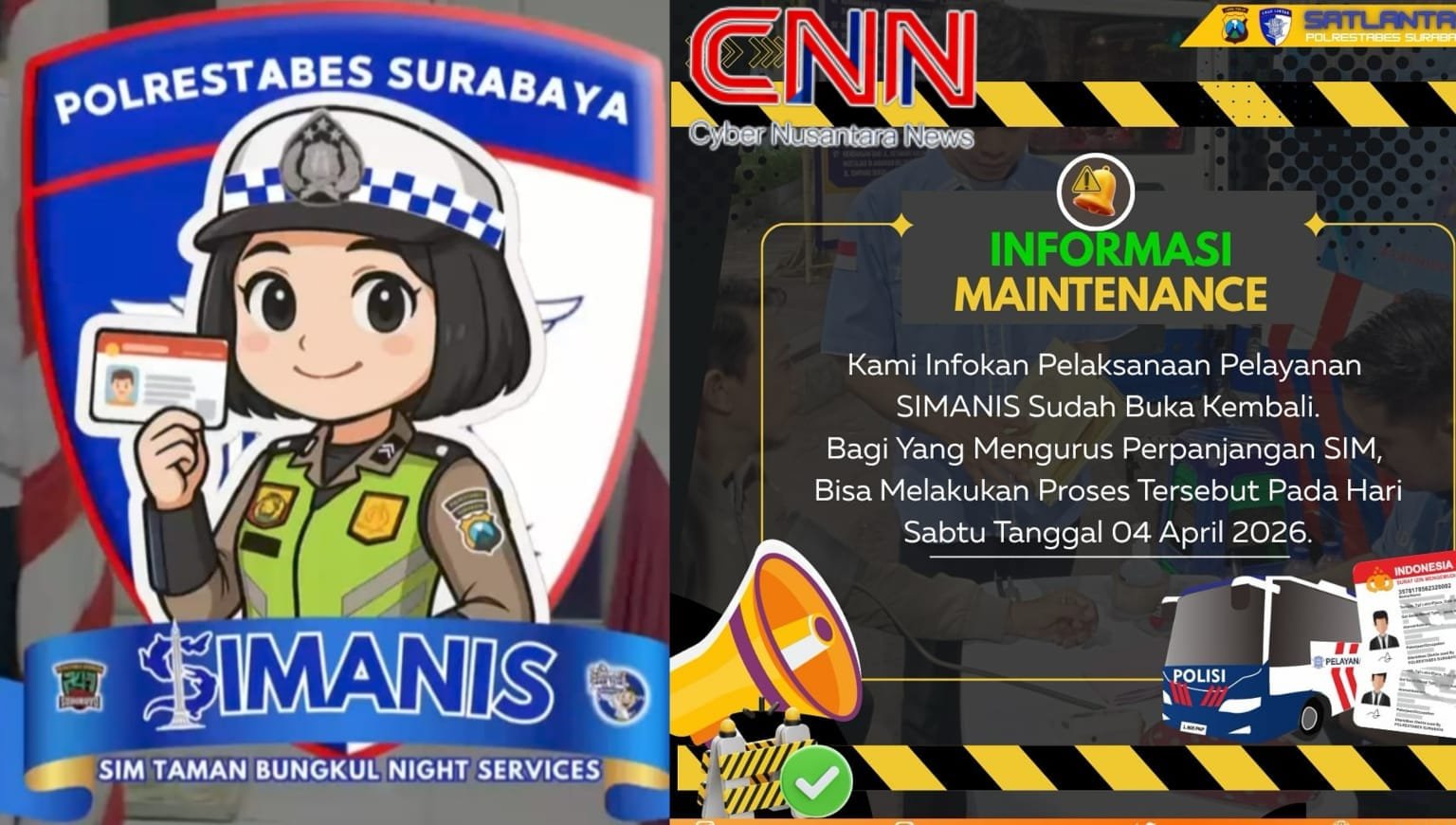 -Layanan SIMANIS (SIM Taman Bungkul Night Services) di Surabaya kembali beroperasi setelah sempat terhenti di akhir bulan Maret 2026. Layanan tersebut untuk perpanjangan SIM A dan C yang fokuskan di Taman Bungkul setiap hari Jumat dan Sabtu pukul 18.00 – 21.00 WIB, untuk memudahkan warga yang sibuk di siang hari.